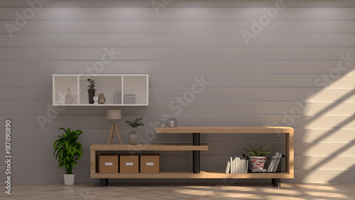 Tv Cabinet In Front Of White Wall With Decorative Items In Vintage