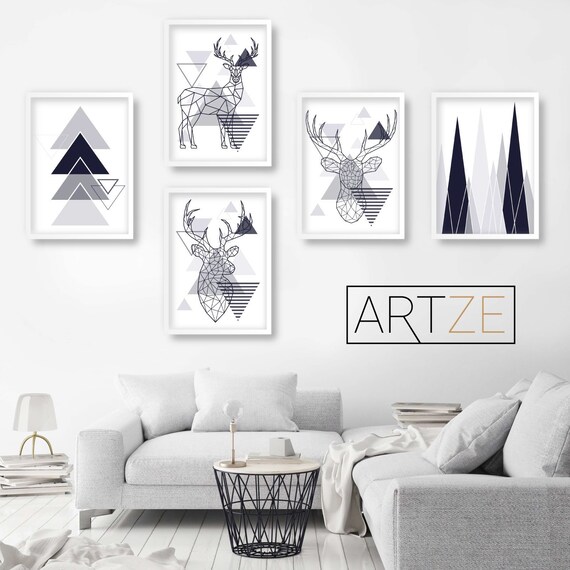 Set Of 5 Scandinavian Geometric Gallery Wall Art Navy Blue And Etsy
