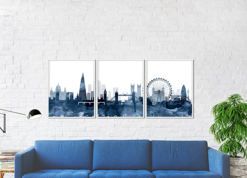 London Skyline Set Of 3 Print London Triptych Watercolor Navy Etsy