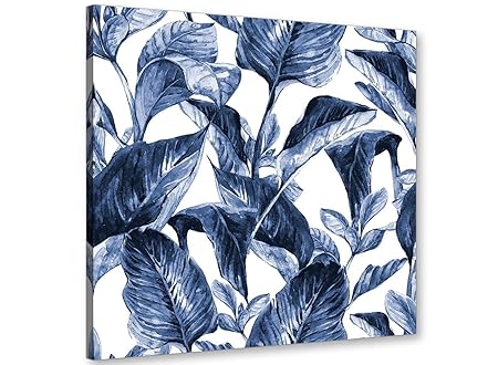 Wallfillers Indigo Navy Blue White Tropical Leaves Canvas Wall Art