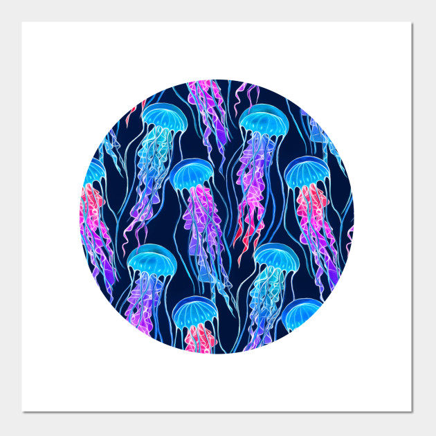 Luminescent Rainbow Jellyfish On Navy Blue Jellyfish Posters