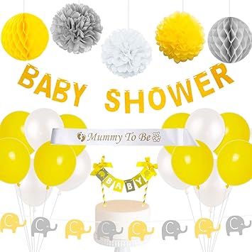 Joymemo baby shower decorations neutral for boy or girl gender neutral unisex balloons garland pom poms paper lanterns yellow and gray. Amazons choice for unisex baby shower pin the dummy on the baby game for 35 players baby shower fun game free delivery white 42 out of 5 stars 108.